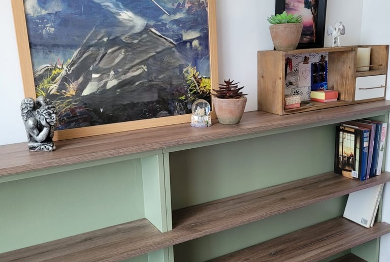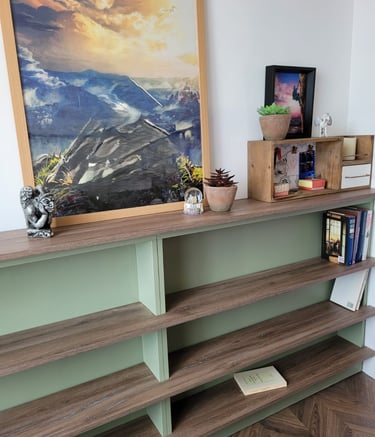 "-Partie de vieux caissons avec une petite profondeur, des portes encombrantes et une problématique d'implantation entre un mur et un conduit de cheminée. J'ai utilisé des planches débordantes pour rectifier la profondeur après enlèvement des portes et fixé les deux meubles ensemble avant de poncer le tout, mettre en peinture et maintenir l'étagère au mur.-"