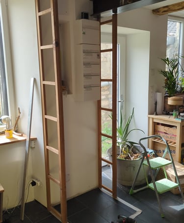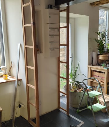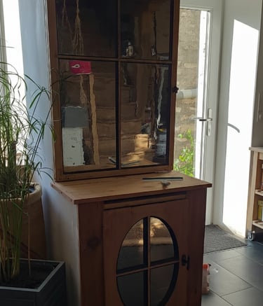 "Partie de vieux caissons avec une petite profondeur, des portes encombrantes et une problématique d'implantation entre un mur et un conduit de cheminée. J'ai utilisé des planches débordantes pour rectifier la profondeur après enlèvement des portes et fixé les deux meubles ensemble avant de poncer le tout, mettre en peinture et maintenir l'étagère au mur."